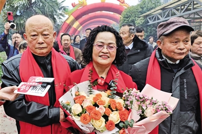 3月15日中午,楊阿娟在兄弟姐妹們的陪伴下,回到闊別65年的老家揚(yáng)州市江都區(qū)濱東村。為歡迎她的到來(lái),家人搭建了11道紅色拱門(mén)。楊阿娟走過(guò)拱門(mén)時(shí)心情激動(dòng),她說(shuō)穿過(guò)拱門(mén)就像穿過(guò)一道通往幸福之門(mén)。
